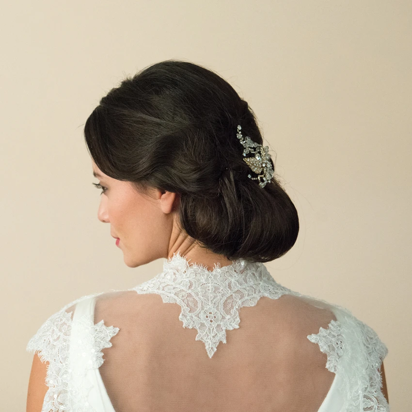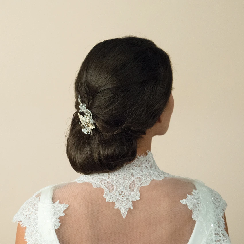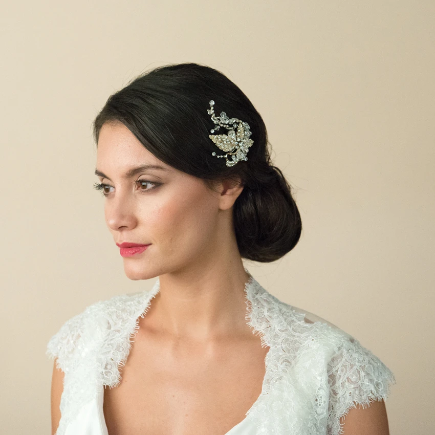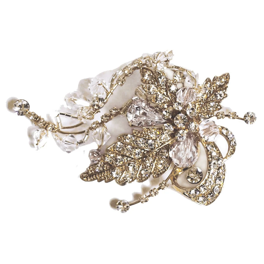 Maggie gold bridal Hairclip by Ivory and Co. A stunning, vintage inspired pave set leaf design clip made using swarovski crystals and multi-faceted beads. This stunning piece is set on a concord clip so its easy to wear and a versatile hair accessory for brides or bridesmaids!