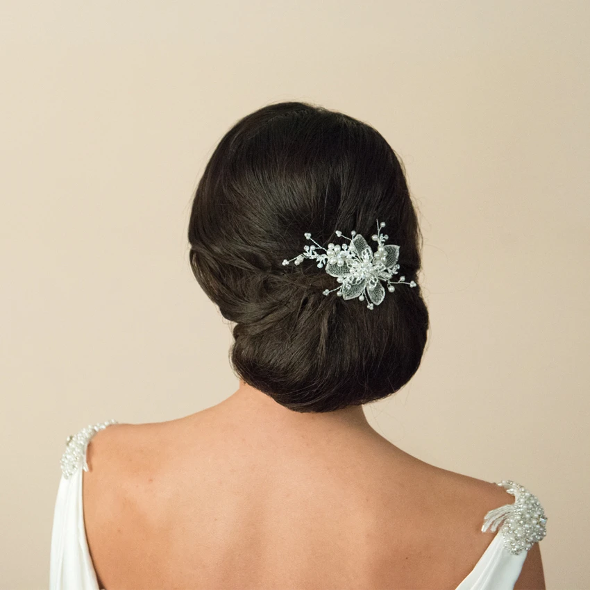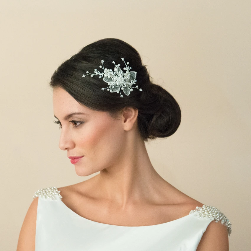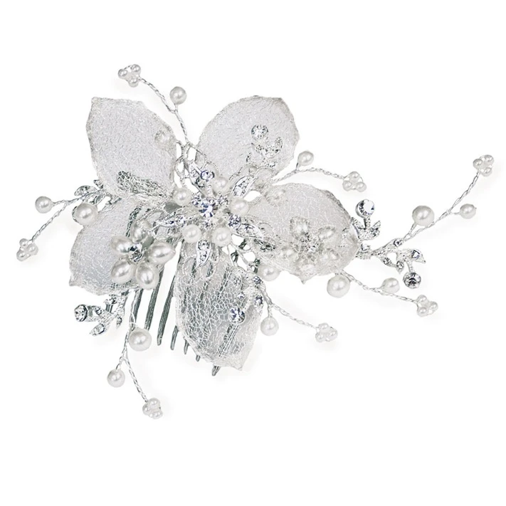 Ivory and Co Magnolia Flower Bridal Comb. A stunning and unusual alternative to a bridal hair flower in the form of a comb based piece with Italian Mesh floral motif embellished with light silver wire sprays of Swarovski crystal stones and freshwater pearl droplets!