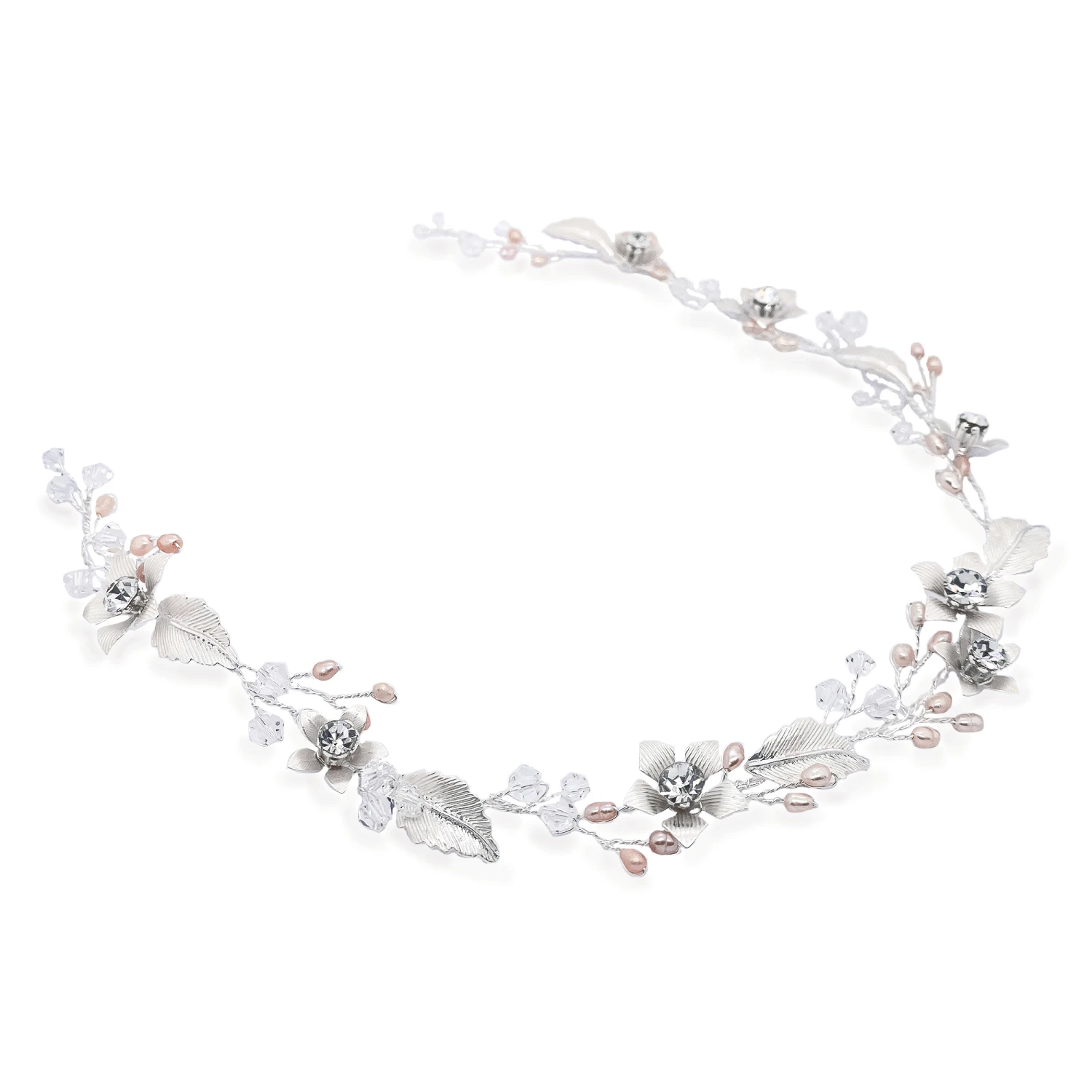 Ivory and Co Mayflower wedding hairvine. An intricate and pretty floral hair vine set with solitaire cut stones, blush toned freshwater pearls andΒ silver tone hand enamelled leaves. This vine is very flexible and can be worn to suit almost any hairstyle.