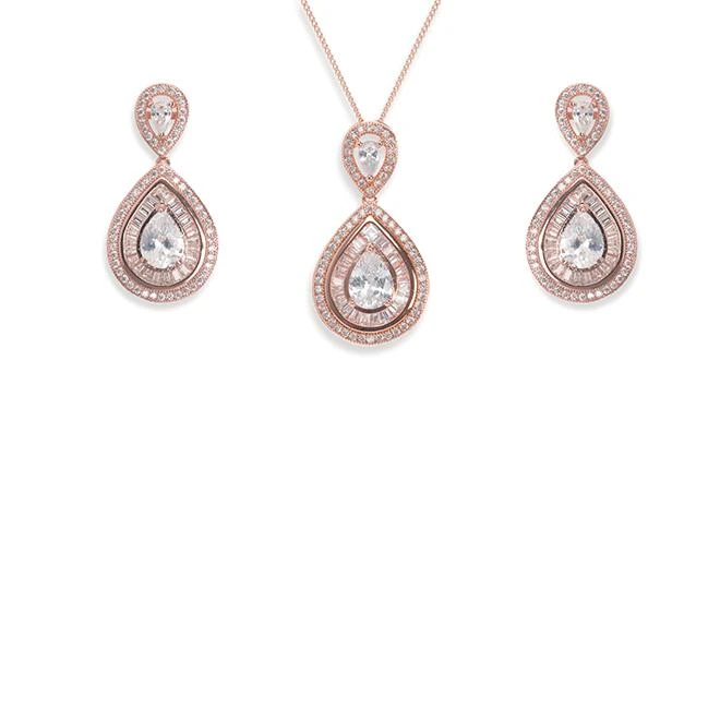 Ivory and Co Montgomery Rose Gold Pendant. This design is stunning and based on stylised Art Deco designs of the 20’s and 30’s. Solitaire, pave and baguette cut stones are used for extra sparkle with a vinatge luxury look!