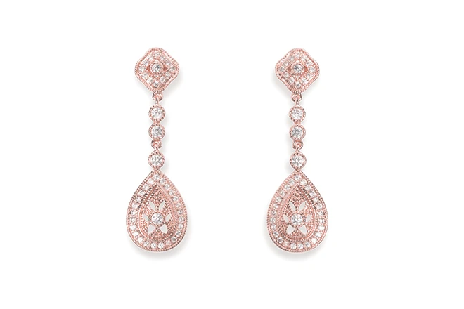 Ivory and Co Jewellery – Moonstruck Rose Gold Earrings. Intricate and utterly vintage-inspired crystal drop earrings moulded in a pretty curved design and delicately set with sparkling Swarovski crystal pattern!