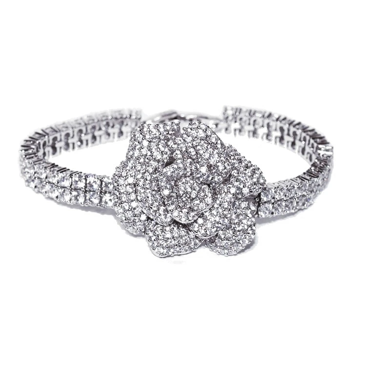 Ivory and Co Jewellery – Rose Garden Bracelet. The ultimate piece of luxury floral bridal jewellery for a romantic finishing touch to your bridal look – central rose design on a double row square stone band