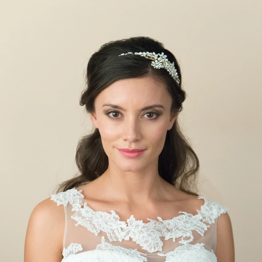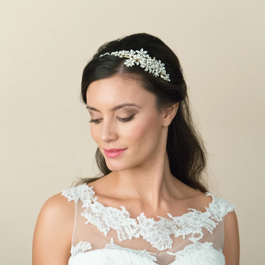 Ivory and Co Safiya Gold Pearl Bridal Headband. A stunning headband with clusters of freshwater pearls and florettes created with sparkling marquise cut stones for a vintage, classic and contemporary bridal look all at the same time!