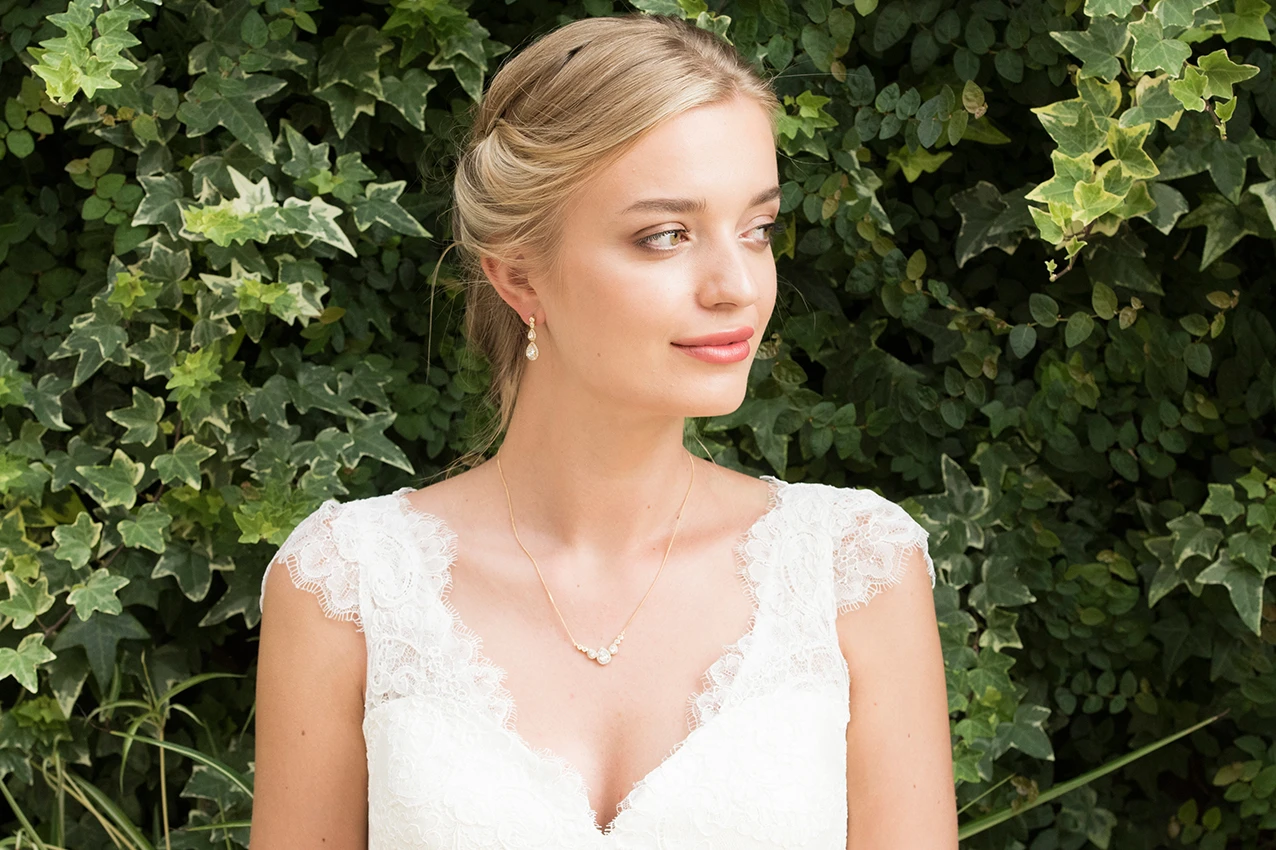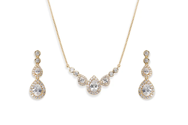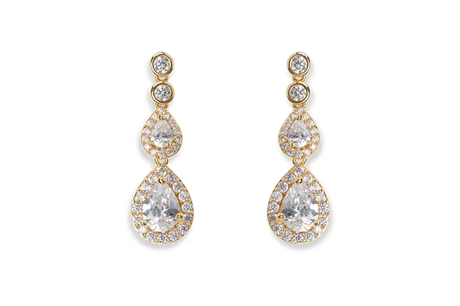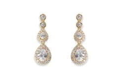 One of our most popular earring designs. The Sorbonne is made up of delicate tears of pave set stones surrounding a tear cut stone. Very elegant in its’ simplicity and a very versatile design that would match many different wedding dress styles.