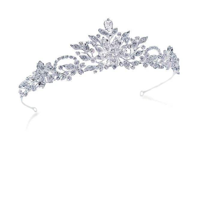 Ivory and Co Stephanie tiara. A delicate and romantic style, set with solitaire stones in a vine of flowers with leaves design topped with a single tear drop shaped stone!