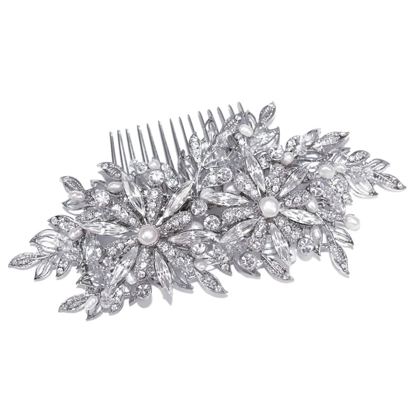 Ivory and Co Venetia Bridal Comb. A stunning, vintage inspired bridal comb with elongated marquise cut stone flowers with pearl centres surrounded by intricate leaf detail and freshwater pearl droplets!