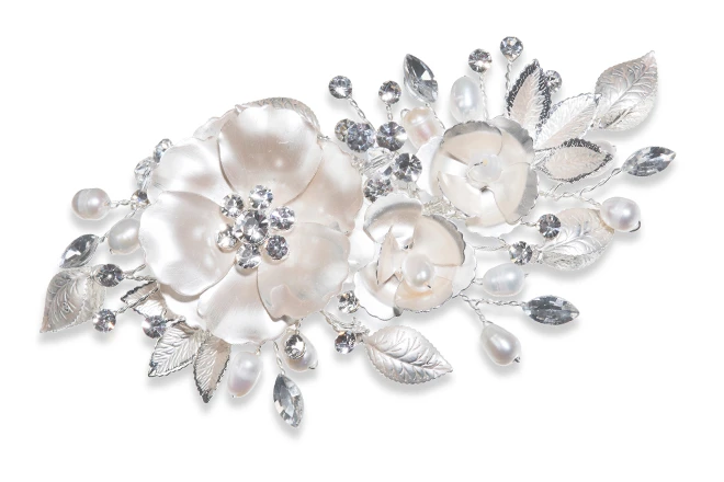 Ivory and Co Winter Rose Hairclip. A pretty and delicate hairclip. Made using cut solitaire and marquise crystals and freshwater ivory pearls, all set in a beautiful design intertwined with enamelled petals and leaves!