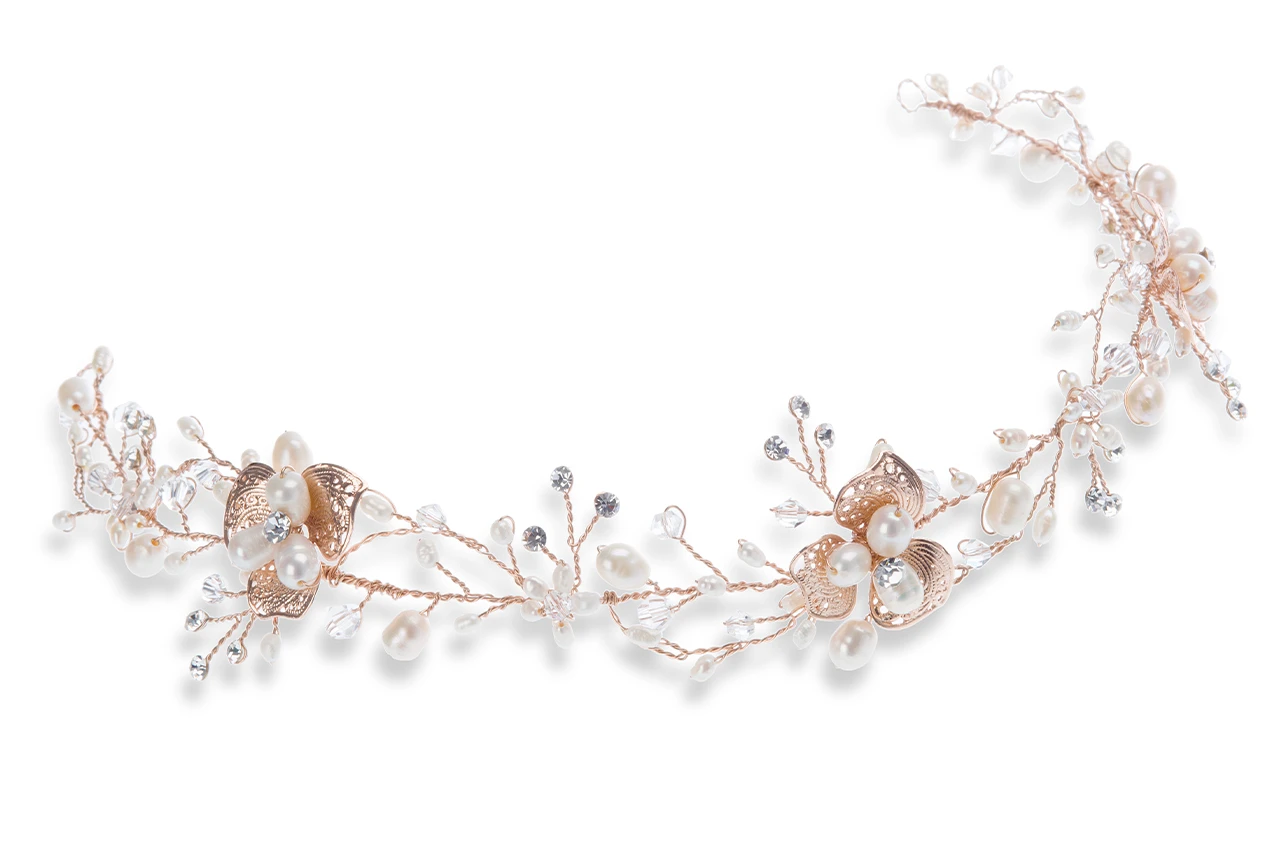 April is a really pretty and delicate hairvine. Sparkling solitaires and crystals with real freshwater ivory pearls are set in a floral vine pattern.