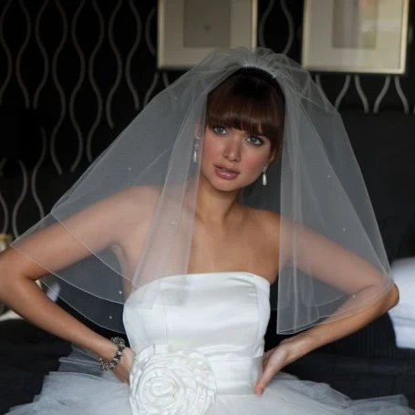 Joyce Jackson Marsala Crystal Wedding Veil. A contemporary, short length veil with delicate picot edging and scattered AB (Aurora Borealis) crystal beads for a subtle sparkle!