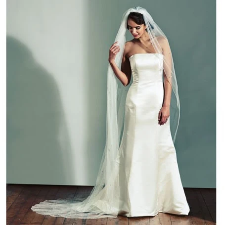 An exquisite veil finished with a myriad of scattered crystals and pearls. Joyce Jackson is a luxury veil brand proud to be providing hand cut veils in a variety of styles.