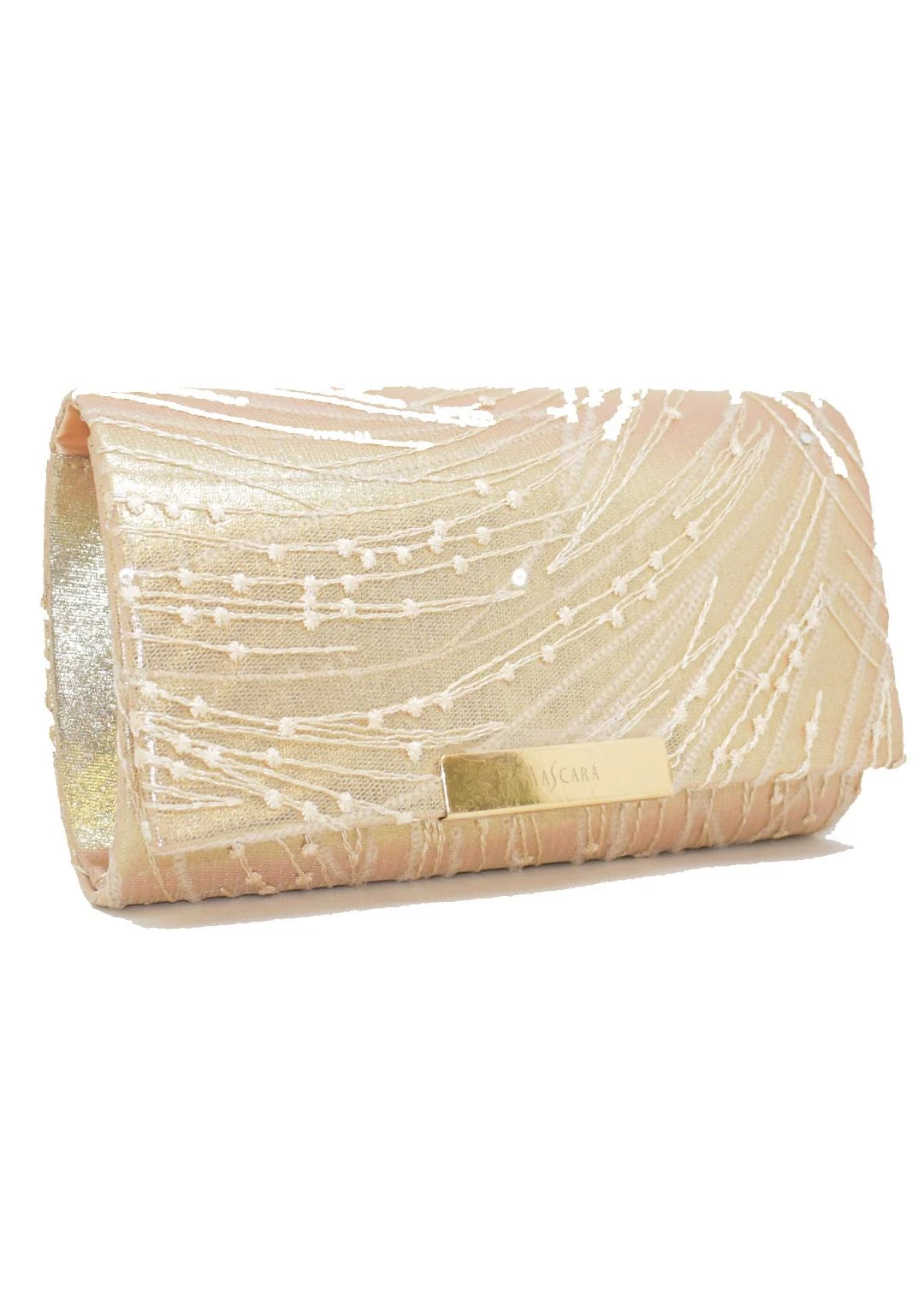This simple champagne clutch in satin, is a classy elegant bag, with a pearl string image. This clutch is perfect for any occasion.