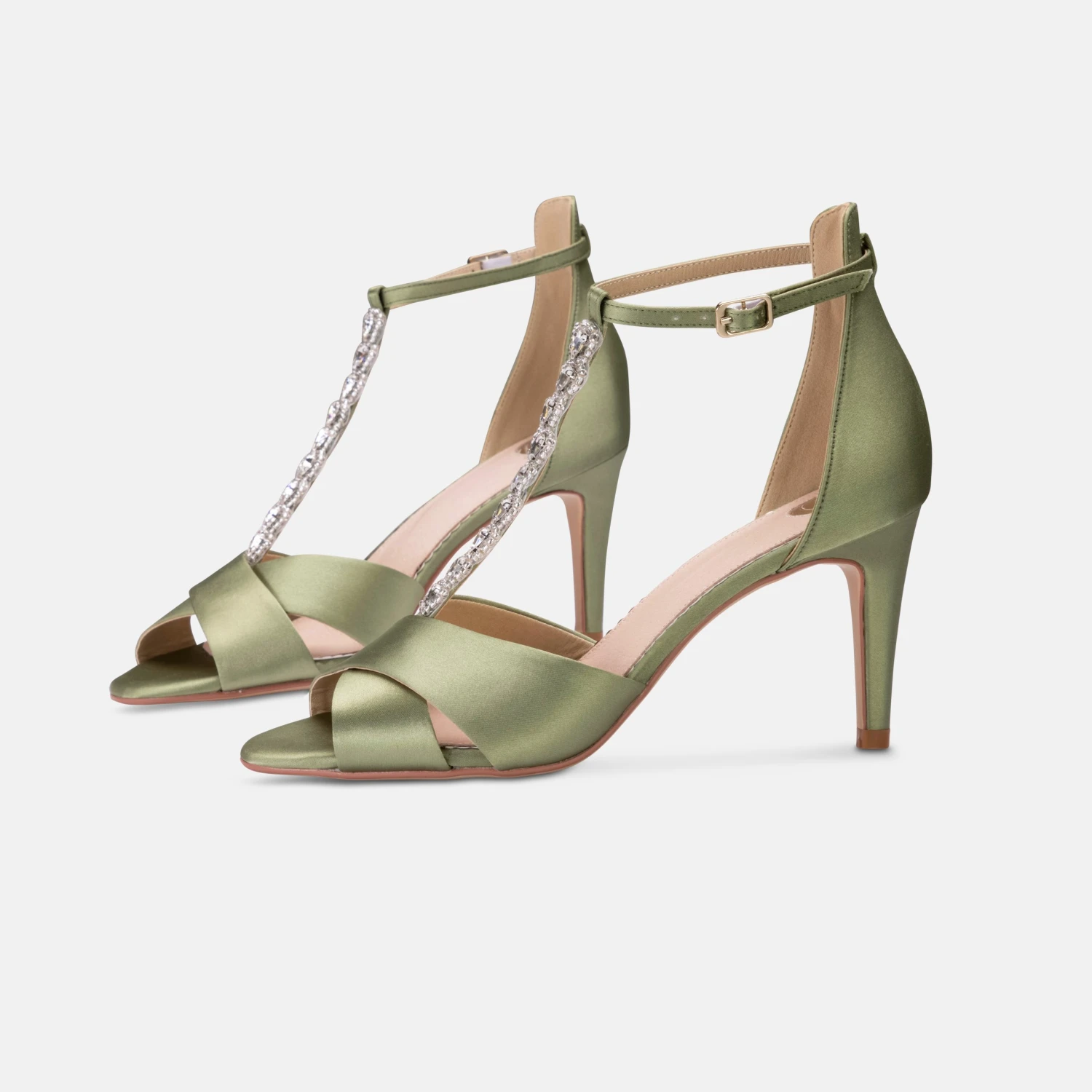 Perfect Bridal Ali Shoes in Olive Satin. Ali are a satin high heeled, peep toe sandals with an ankle strap and sparkly crystal T-bar.. Ali are perfect for the whole wedding day or the evening reception to dance the night away!
