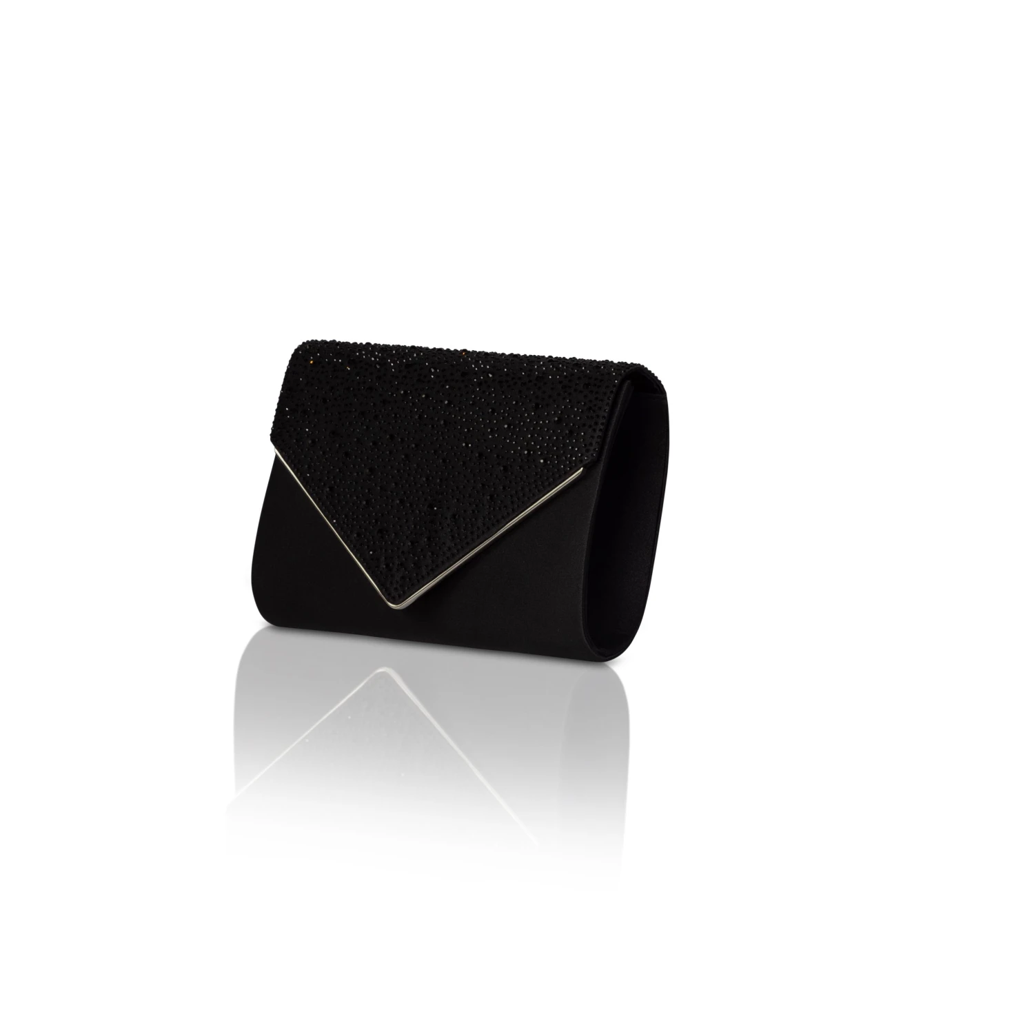 Perfect Bridal Anya Bridal bag. A modern, clutch bag with an envelope flap fastening in a black satin with diamantes on the flap! A matching satin lining and a chain strap to enable a hands free mode!