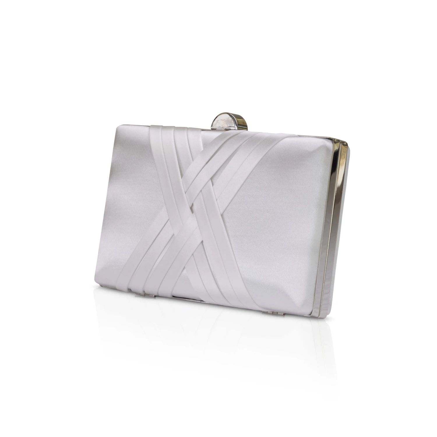 This beautiful Bay clutch is sleek and slender with a snap fastener. Crafted in Ivory satin with a woven criss cross design and lined with a matching colour satin. Comes with a short and a long strap making this bag extremely versatile. This design is perfect for any occasion and is a classic accessory.
