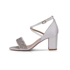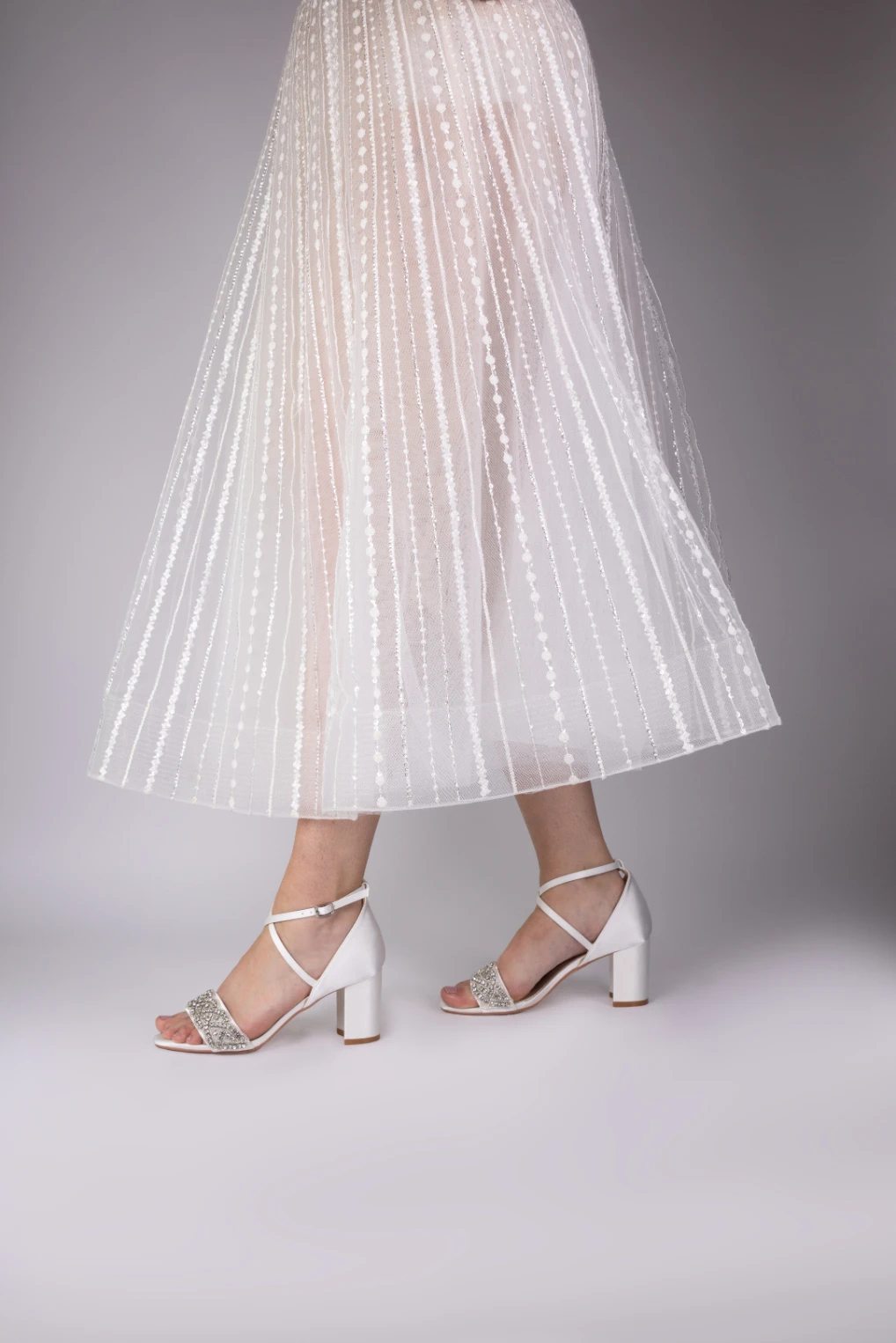Perfect Bridal Blair is pure luxury. Made in a non dyeable Ivory Satin with sparkling crystals across the toe strap. With a mid-height block heel and a delicate cross over ankle strap these are the perfect shoes to keep you feeling comfortable all day or all through the evening whilst partying!