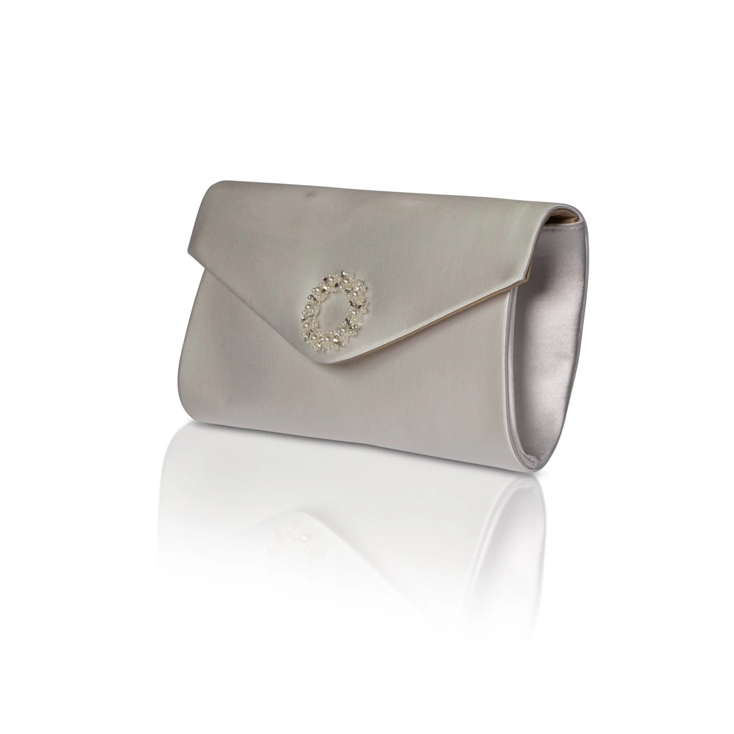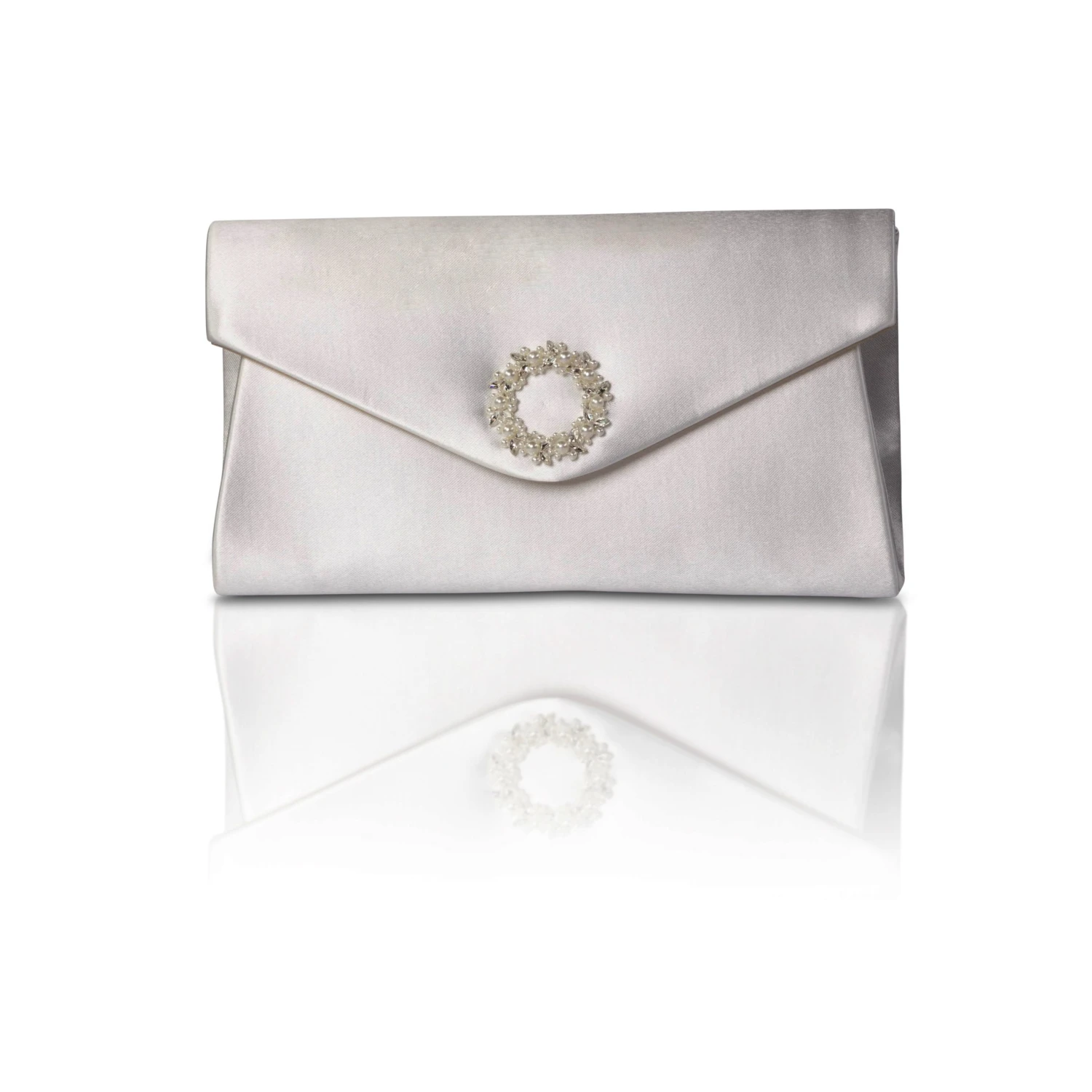 Perfect Bridal Bridget Bridal bag. A modern, clutch bag with an envelope flap fastening in a dyeable ivory satin with a pretty circular crystal and pearl embellishment on the flap! A matching satin lining and a chain strap to enable a hands free mode!