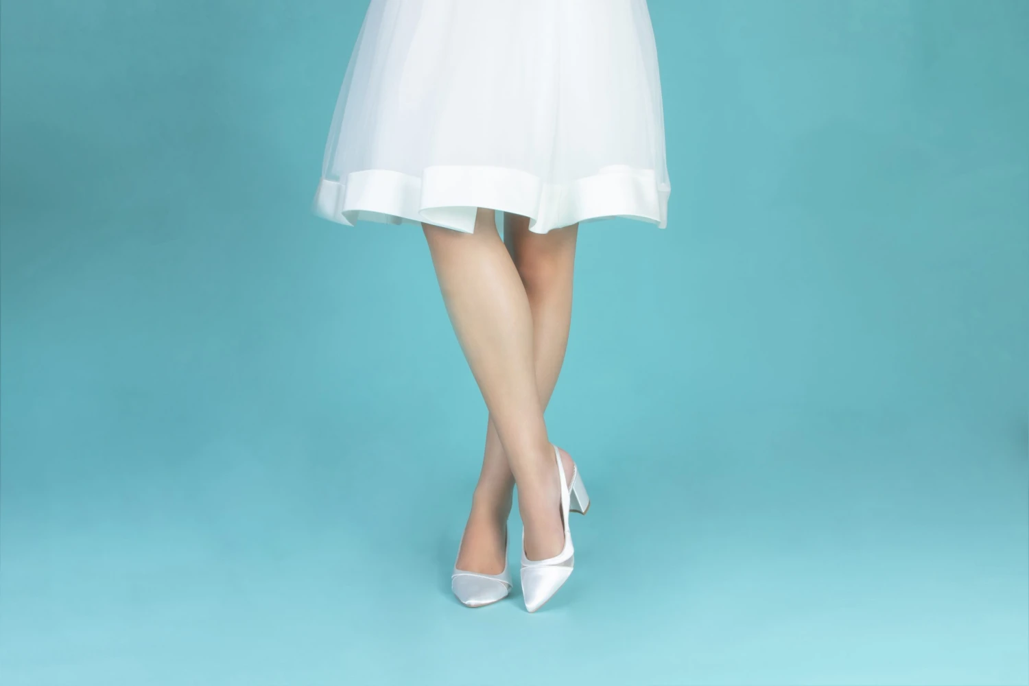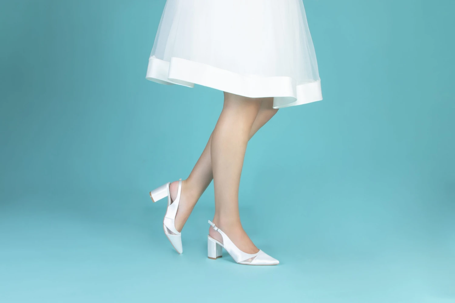 Perfect Bridal Brooke Shoe in Ivory Satin with mesh cut out. Brooke are a satin mid heeled sandal with a fully enclosed pointed toe incorporating the mesh cut out, block heel and sling back to keep you feeling in control. The mesh adds that bit of glam. This shoe is perfect for the whole wedding day and the evening reception, to dance the night away!