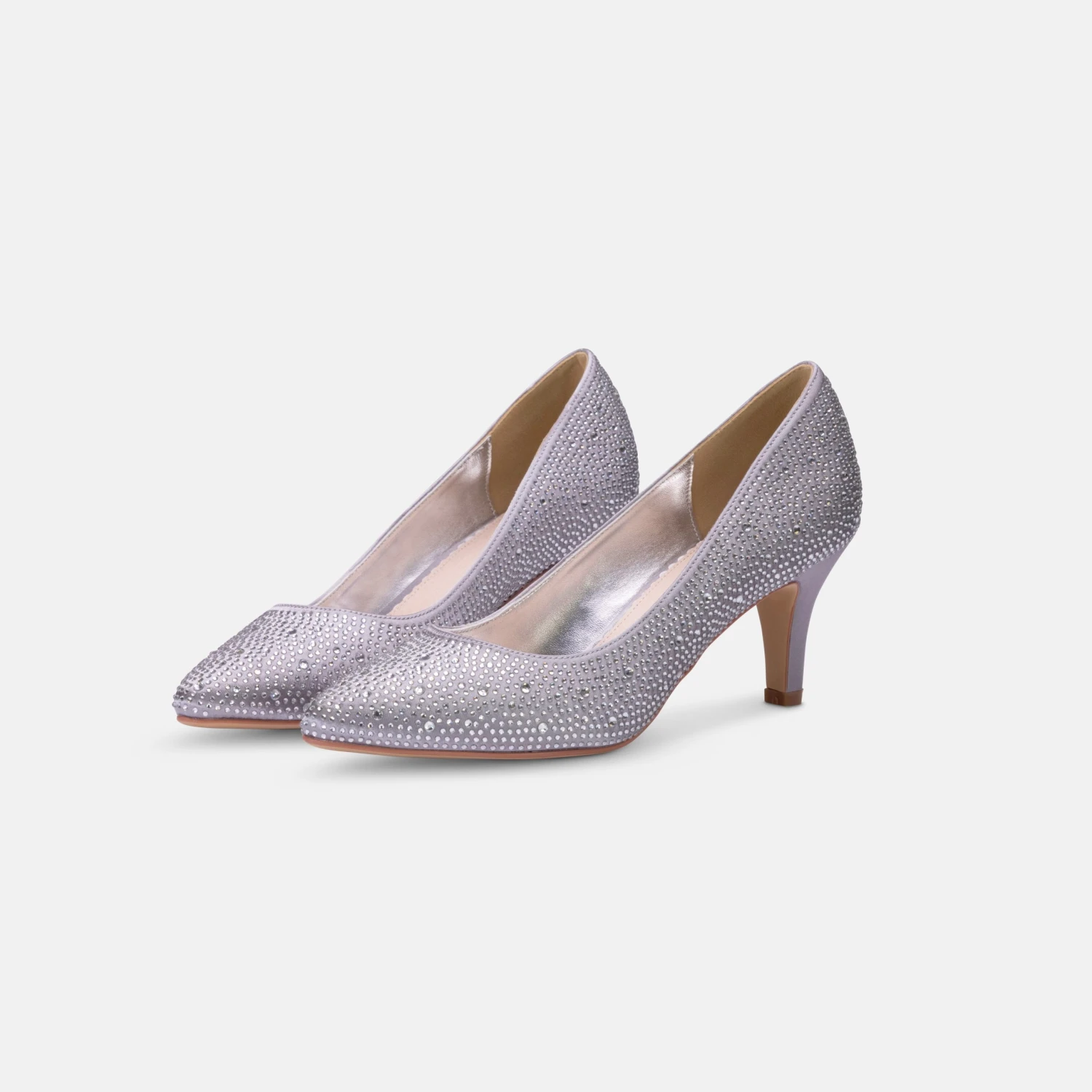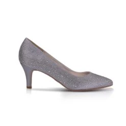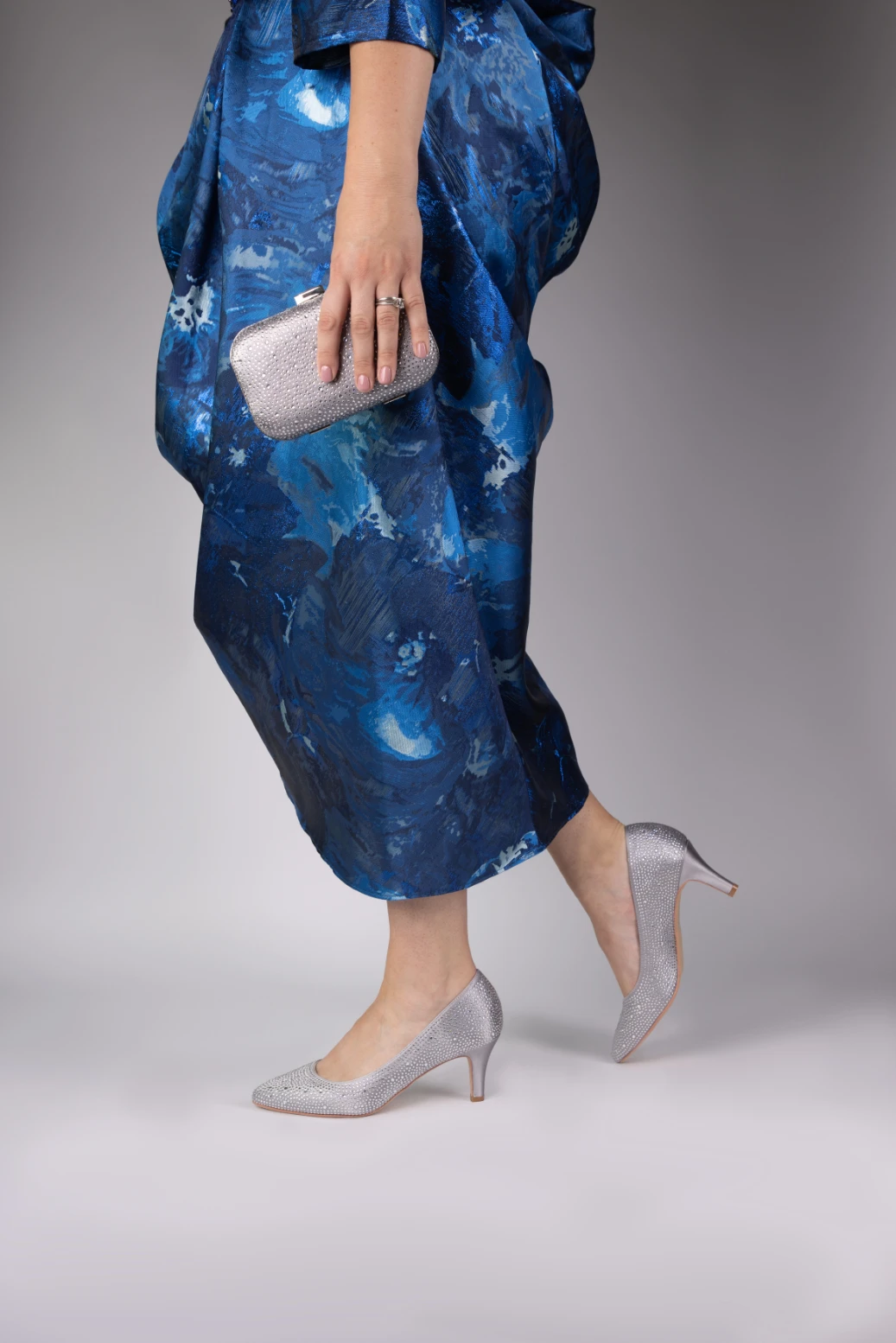 Perfect Bridal Calypso in Silver Diamante Encrusted Satin. Calypso are a sparkly satin court shoe with a delicately pointed toe, slim, mid height heel and luxury leather insole. Perfect to add that sparkle to any type of event!