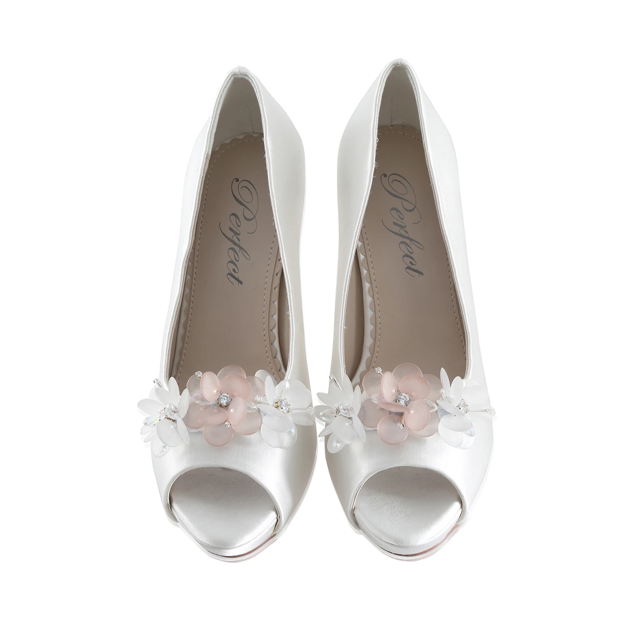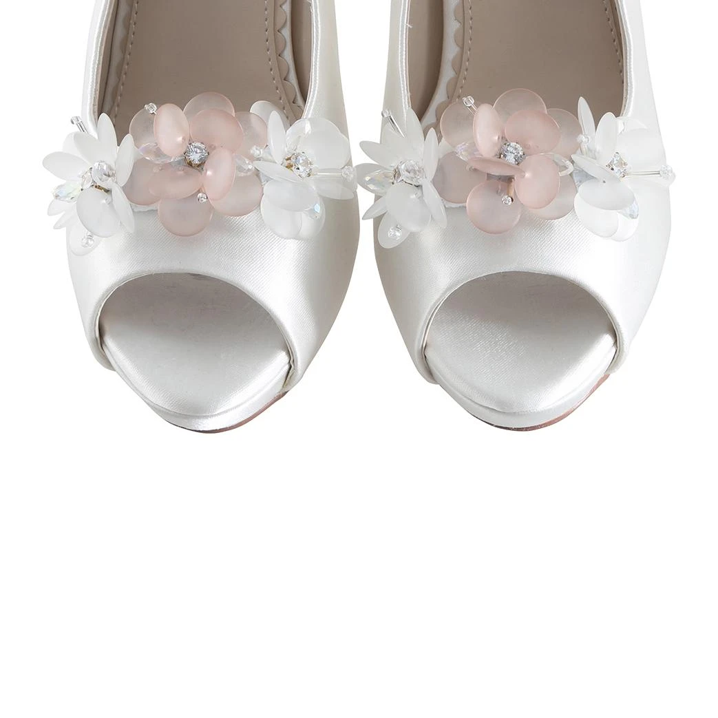 Perfect Bridal Damson Shoe Trims. Damson is a quality bridal shoe trim in a pretty floral design composed of glass and crystal embellished on white and blush pink  flowers made from a delicate textile.