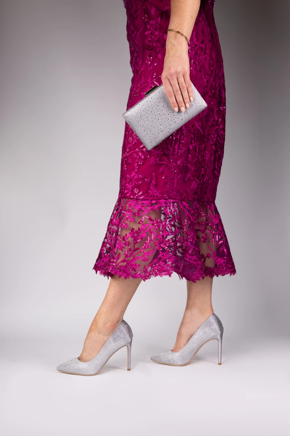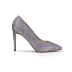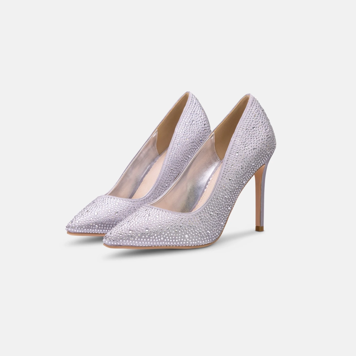 Perfect Bridal Electra Shoes in Silver Satin with Heat-seal crystals. Electra are a sparkly satin court shoe with a delicately pointed toe, slim heel and luxury leather insole. Perfect to add that sparkle to any type of event!