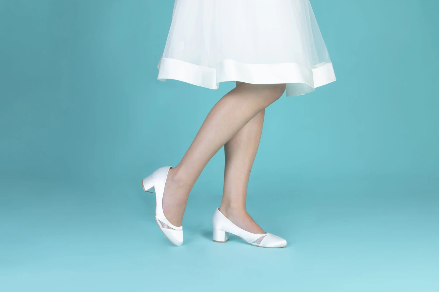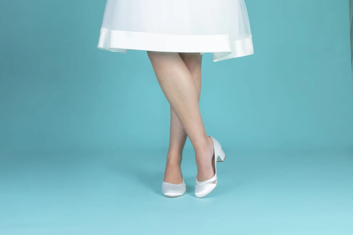 Perfect Bridal Emily Shoes. Emily is so simple and yet so elegant. Stunning in ivory satin with a mesh inlay and perfectly comfortable on a mid high block heel with extra cushioning for comfort all day on that special day!