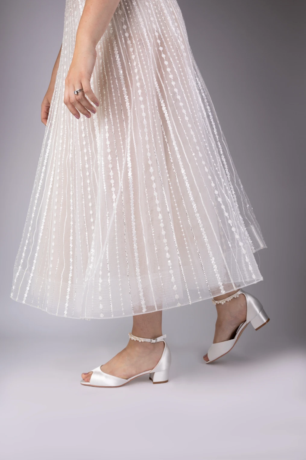 Perfect Bridal Fiona Shoes in Ivory Satin. Fiona are a sleek ivory satin open toed shoe with a pearl encrusted satin high ankle strap. Low block heeled sandals which are perfect for the whole wedding day experience!