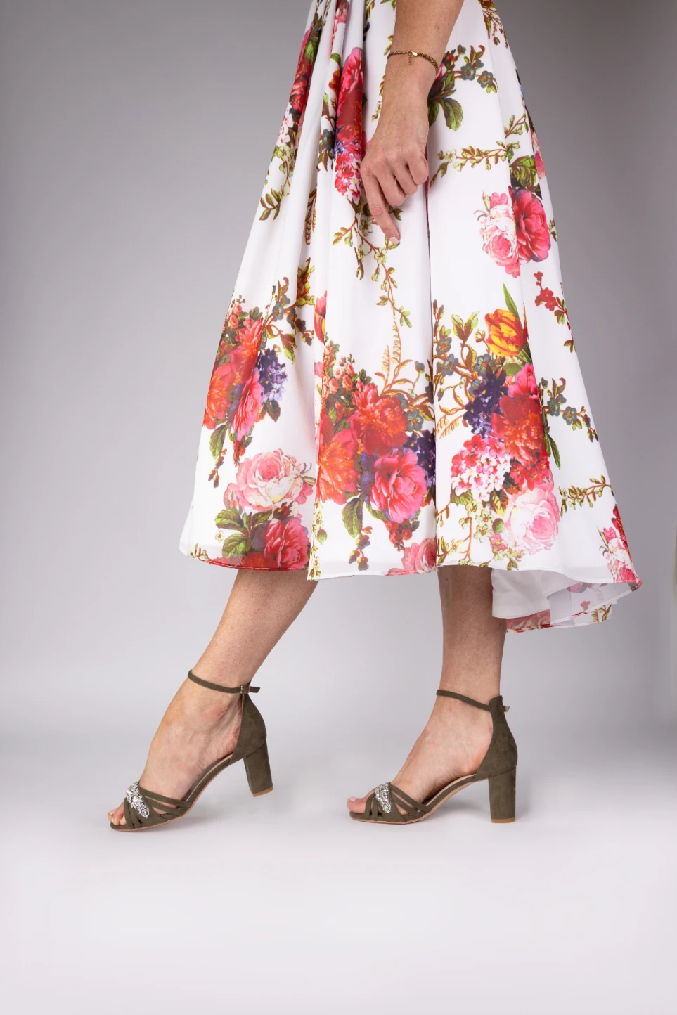 Perfect Bridal Frankie Shoes in Olive Ultrasuede. Frankie are sleek, multi strapped Olive Ultrasuede open toed sandals with a crystal trim over the toe of the sandal. The mid height, block heeled sandals have a high ankle strap making them perfect for the evening reception to dance the night away!