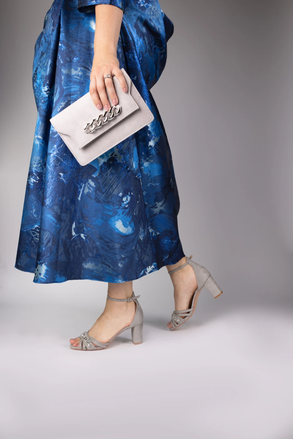 Perfect Bridal Frankie Shoes in Stone Ultrasuede. Frankie are sleek, multi strapped Stone Ultrasuede open toed sandals with a crystal trim over the toe of the sandal. The mid height, block heeled sandals have a high ankle strap making them perfect for the evening reception to dance the night away!