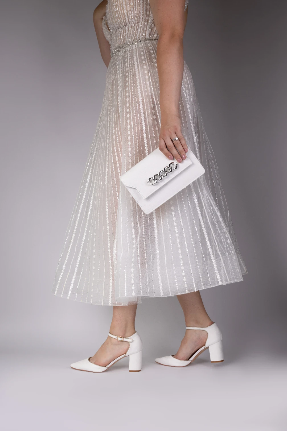 Perfect Bridal Freya Shoes, wide fit. A perfectly stunning dyeable Ivory Satin shoe with a fully enclosed pointed toe and mid height block heel with an adjustable ankle strap to ensure you feel secure and confident!