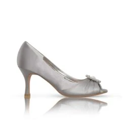 Perfect Bridal Gina Silver Satin occassion shoes. A practical and utterly comfortable mid heel peep toe style in a classic court shape with pleated satin and a crystal brooch for added chic!