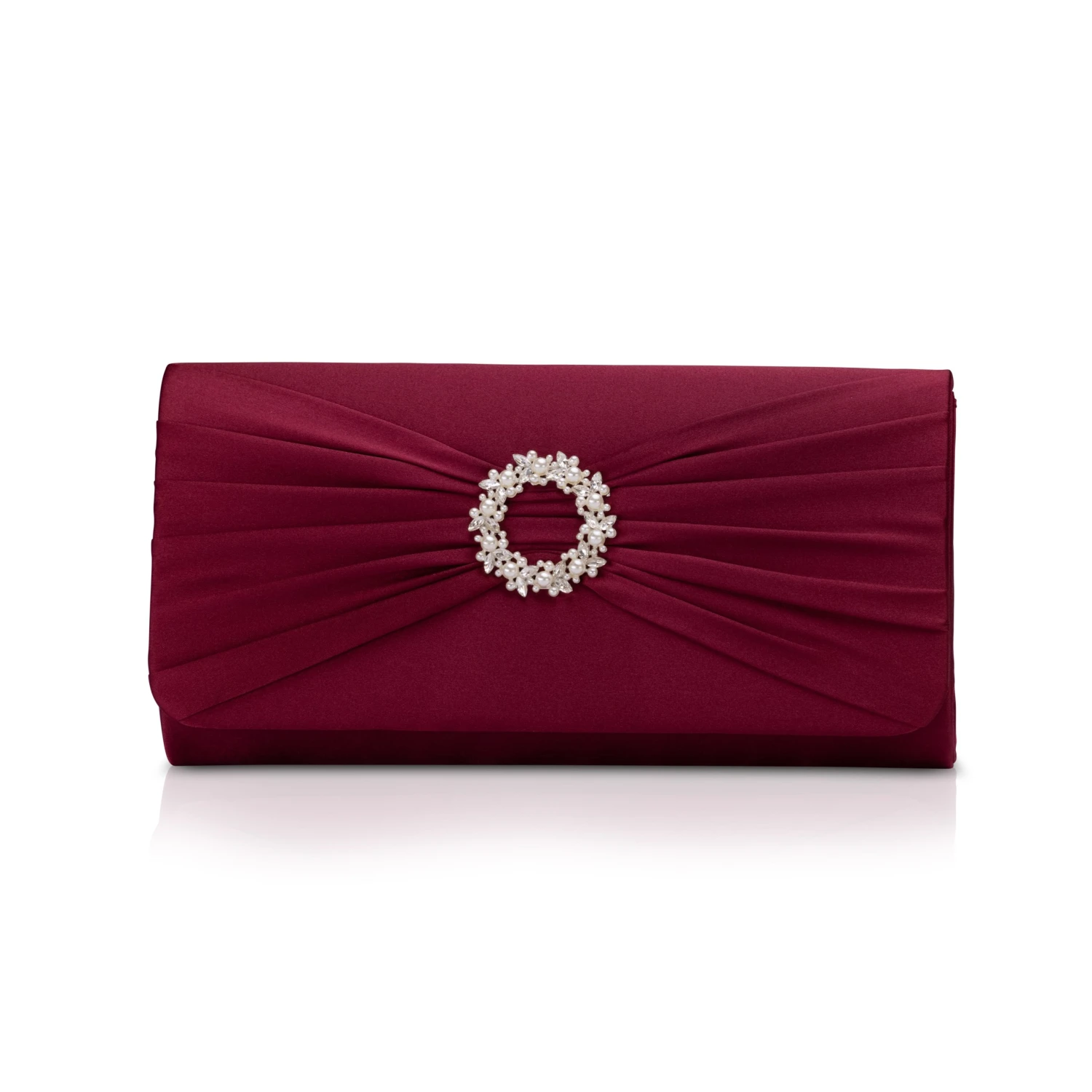 Perfect Bridal Harlow Handbag. A modern, compact clutch bag in Berry satin with a gathered assymetric flap and a sparkly crystal and pearl circular embellishment with a press stud fastening!