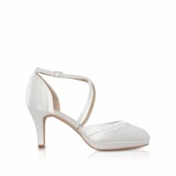 Perfect Bridal Isobel Shoes in dyeable Ivory Satin. Isobel are a high slim heel shoe with a hidden platform, almond toe and perfect fit adjustable criss cross strap to ensure that no matter the shape of your foot, you will feel comfortable and confident in them all day long!