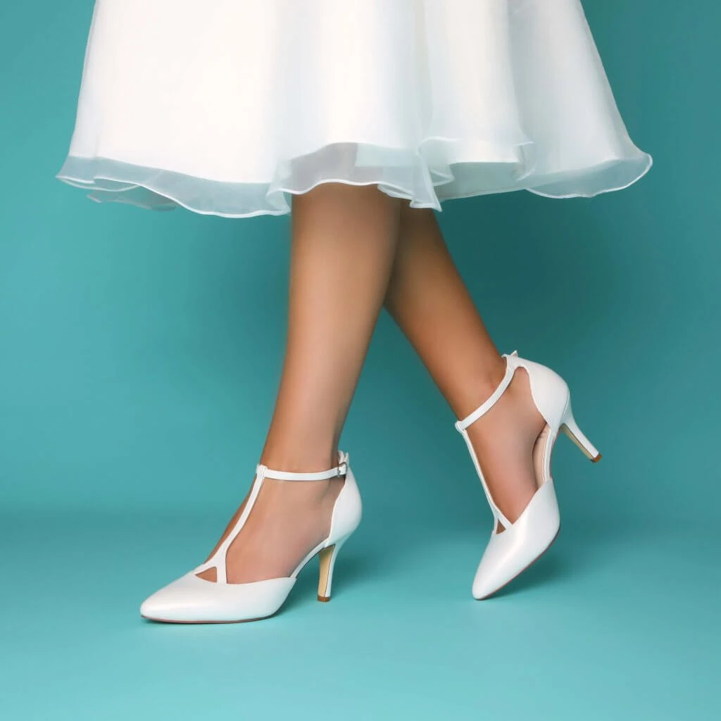 Perfect Bridal Jaime Shoes in Ivory Pearlescent Leather. Jaime are an ivory leather mid shoe with a high slim heel and an adjustable t-bar ankle strap making it perfect for the whole wedding day!
