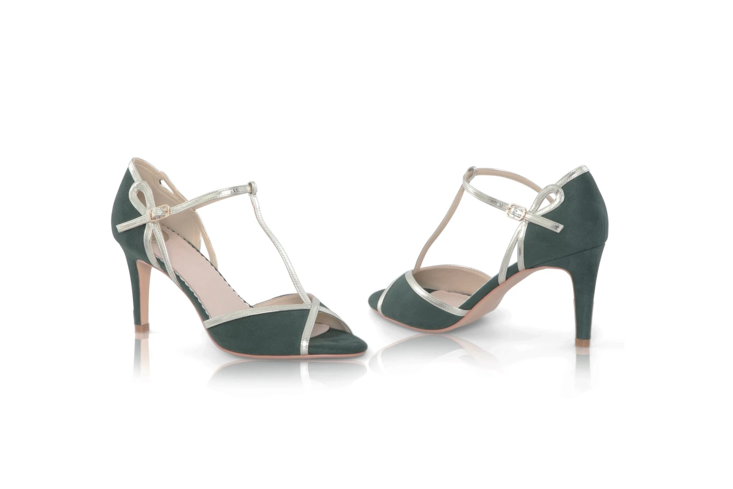 Perfect Bridal Joanna Ultrasuede Forest Green and Gold the ultimate shoes for every occasion. Taking you through from day to night, office to bar, wedding ceremony to reception theses heels will work anywhere! The matt finished ultra suede paired with a little shimmer make a statement without being showy.