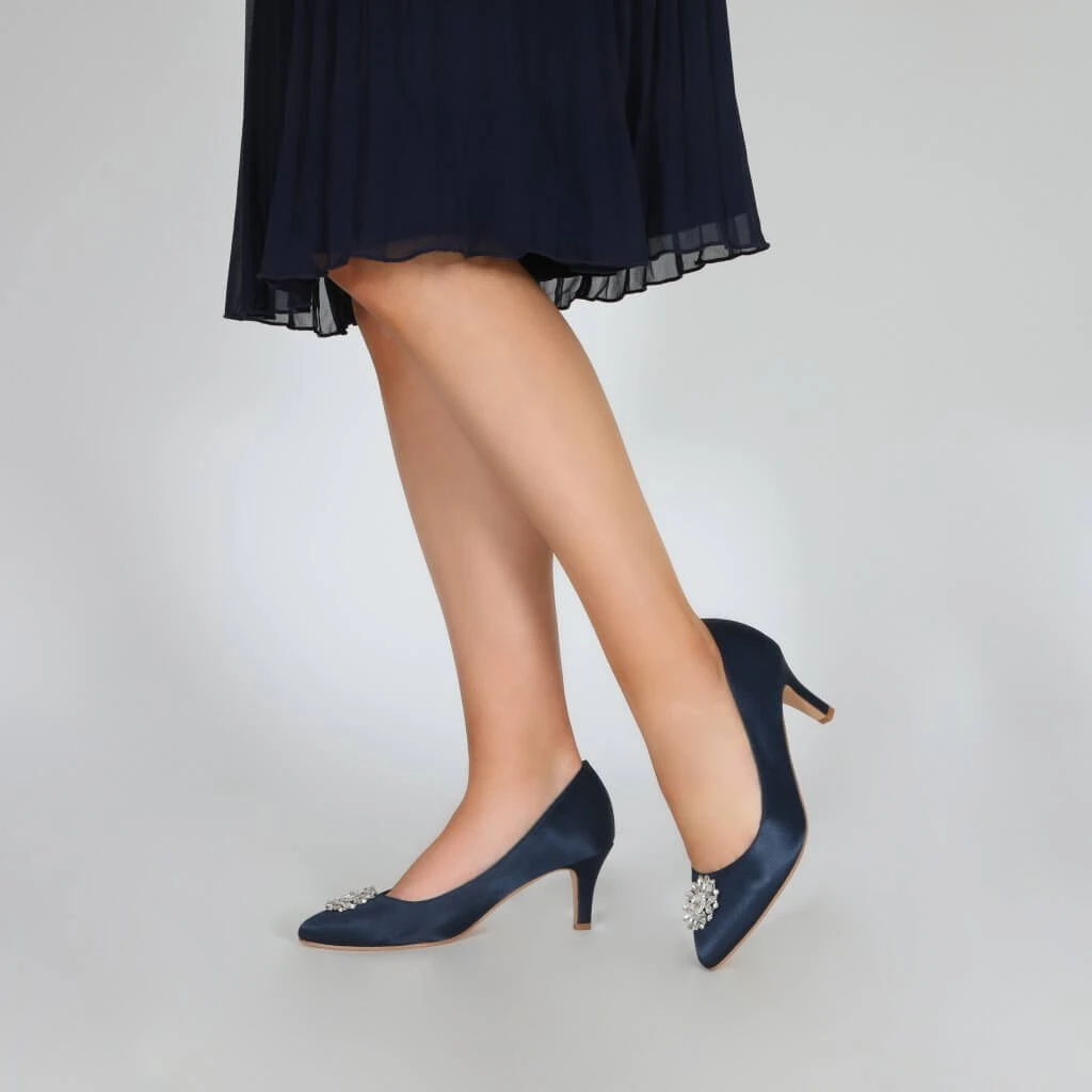 Perfect Bridal Katrin is a simply sweet navy satin court shoe with a sparkly crystal brooch on the front, the perfect party shoes for your special event or just a fun night out with the girls!