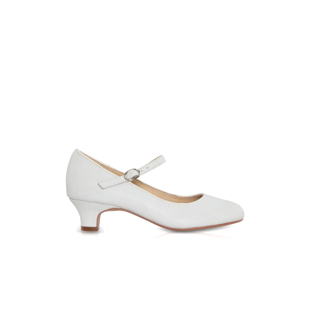 Perfect Bridal Kylie shoes. Stunning, classic white glitter fabric bridesmaid shoes with a soft-round toe design finished with a dolly bar feature and sturdy kitten heel!