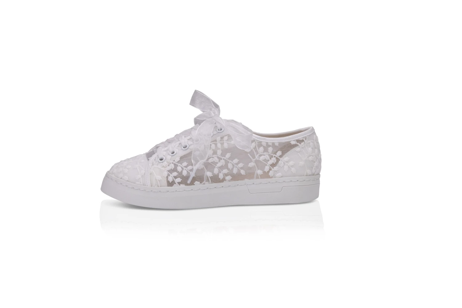 Perfect Bridal Oakley kids are a classic pair of Childrens Sneakers which are exceptionally comfortable making them ideal to wear all day long. Made with unlined delicate lace , white satin, secured with Chiffon laces. A sturdy rubber sole and the cushioned leather sock make these super comfy.