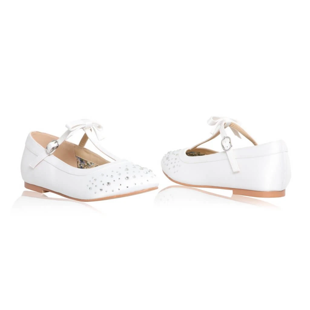 Perfect Bridal Kids shoes from the Communion Collection. Ruthie is a pretty flat heeled court shoe in White Satin with sparkling diamantes across the toe and finished with a T-bar embellished with a pretty bow!