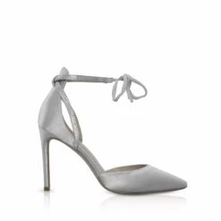 Perfect Bridal Kimi Shoes. A perfectly stunning silver satin with a fully enclosed almond toe and high slim heel with a trim and an ankle strap sprinkled with heat sealed gemstones and tied with ribbon to ensure you feel secure and confident!