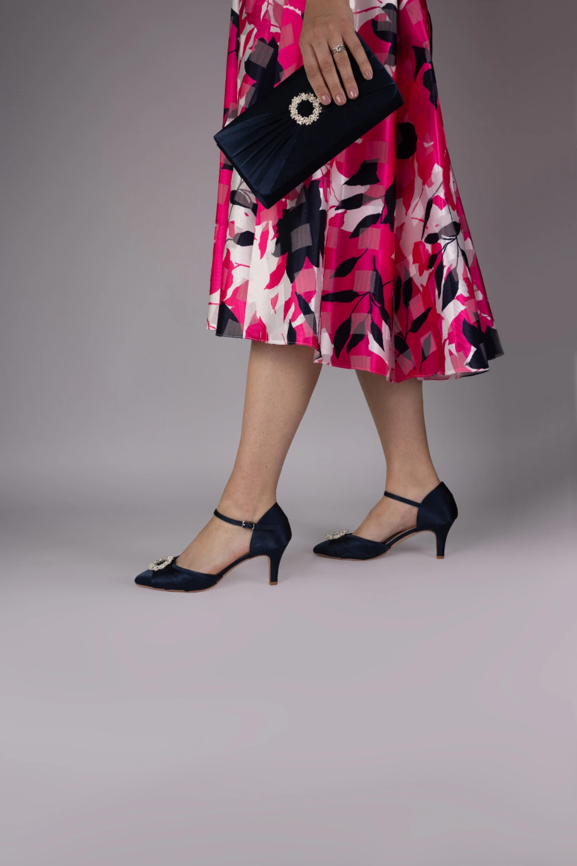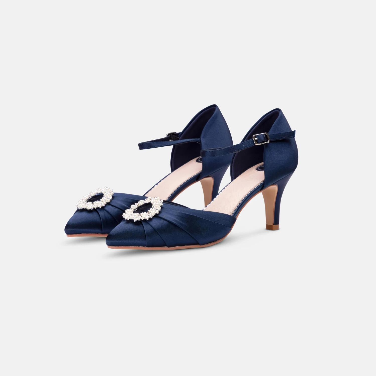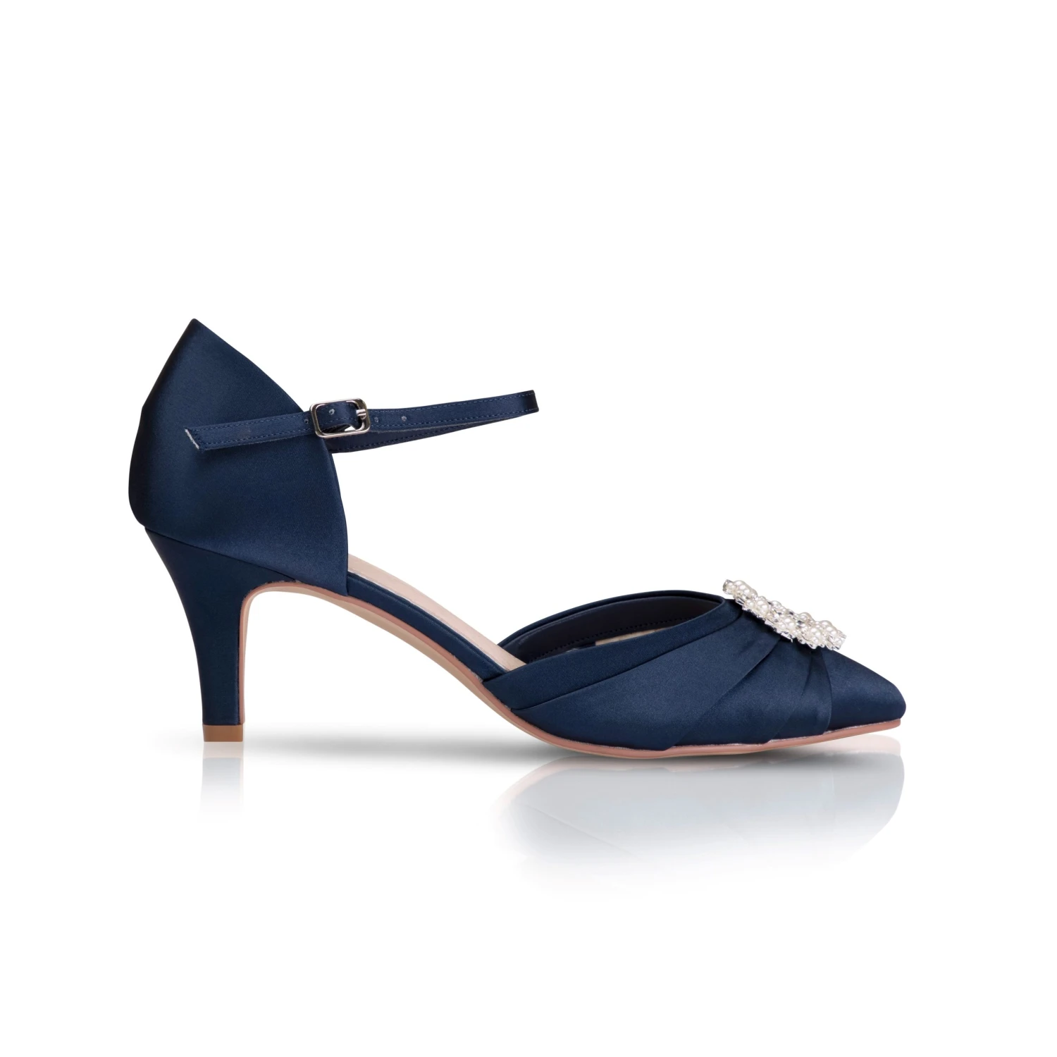 Perfect Bridal Kitty Shoes. A perfectly stunning Navy Satin shoe with a fully enclosed pointed toe and mid height kitten heel with an adjustable ankle strap to ensure you feel secure and confident. A Crystal and Pearl trim on the front of the shoe adds that bit of sparkle!