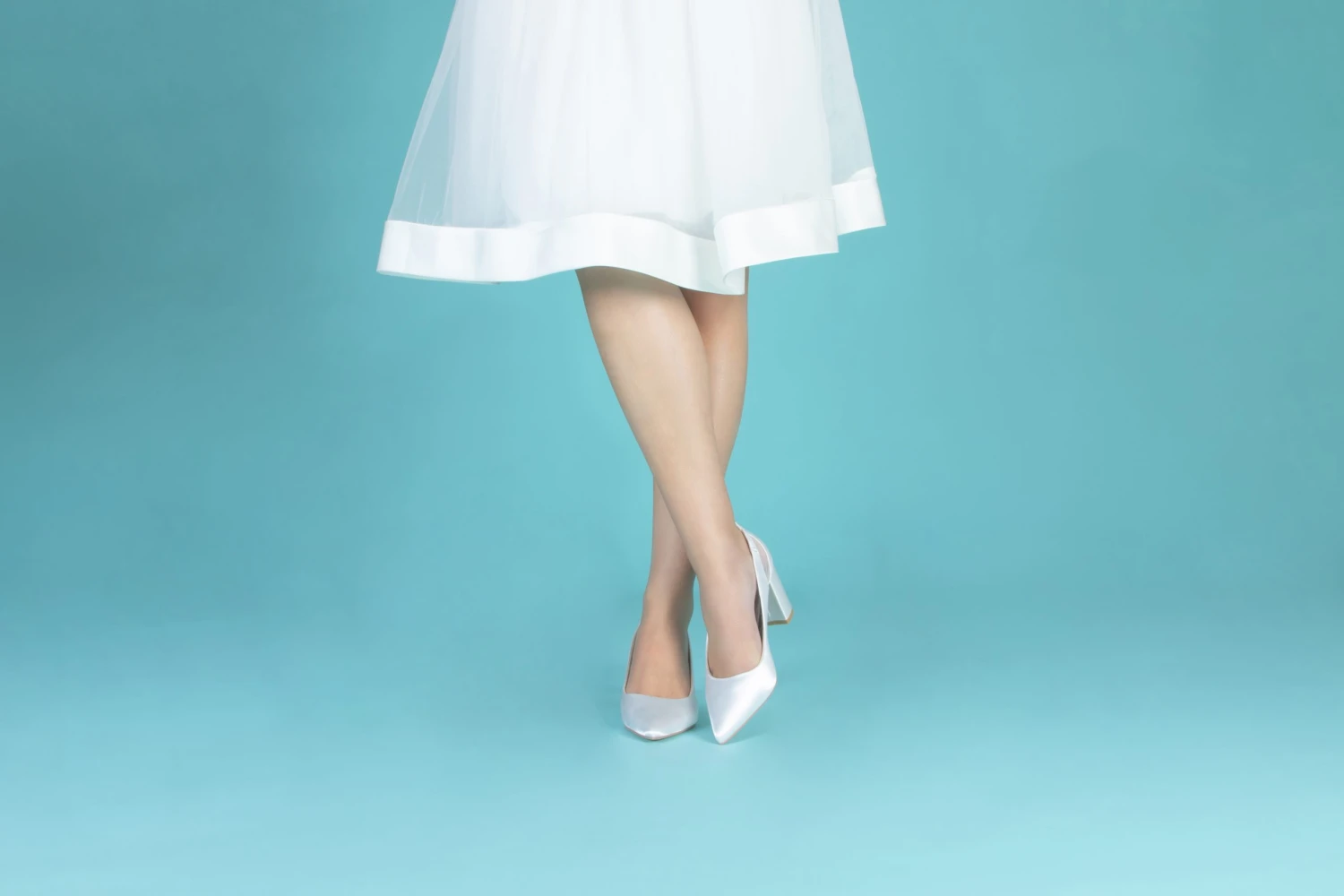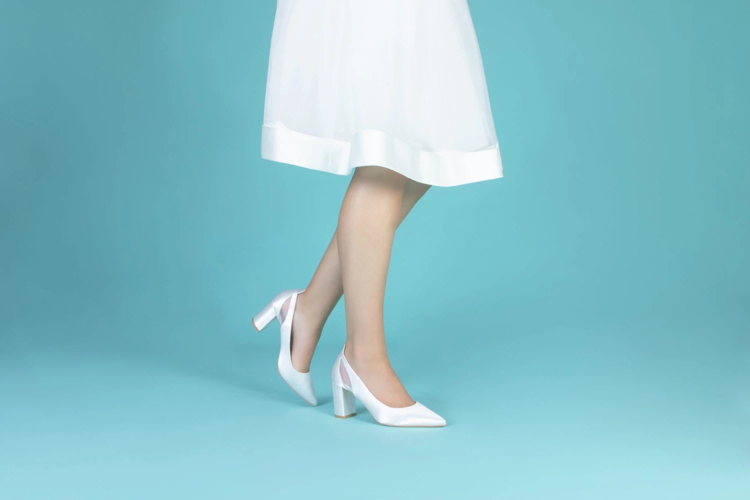Perfect Bridal Layla Court Shoes. A perfectly elegant , simple court shoe in dyeable ivory satin with Mesh inserts at the heel and a pointed toe. Perfectly comfortable all day long with a leather and fabric cushioned lining and fully cushioned leather sock, a court shoe on a mid height heel in beautifully softly hued satin!