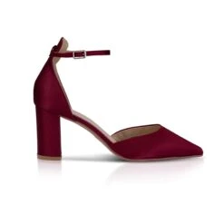Perfect Bridal Liberty Shoe in Berry Satin. Liberty are a satin, mid heeled sandal with a fully enclosed pointed toe, block heel and high back ankle strap to keep you feeling in control. This shoe is perfect for the whole wedding day and the evening reception, to dance the night away!