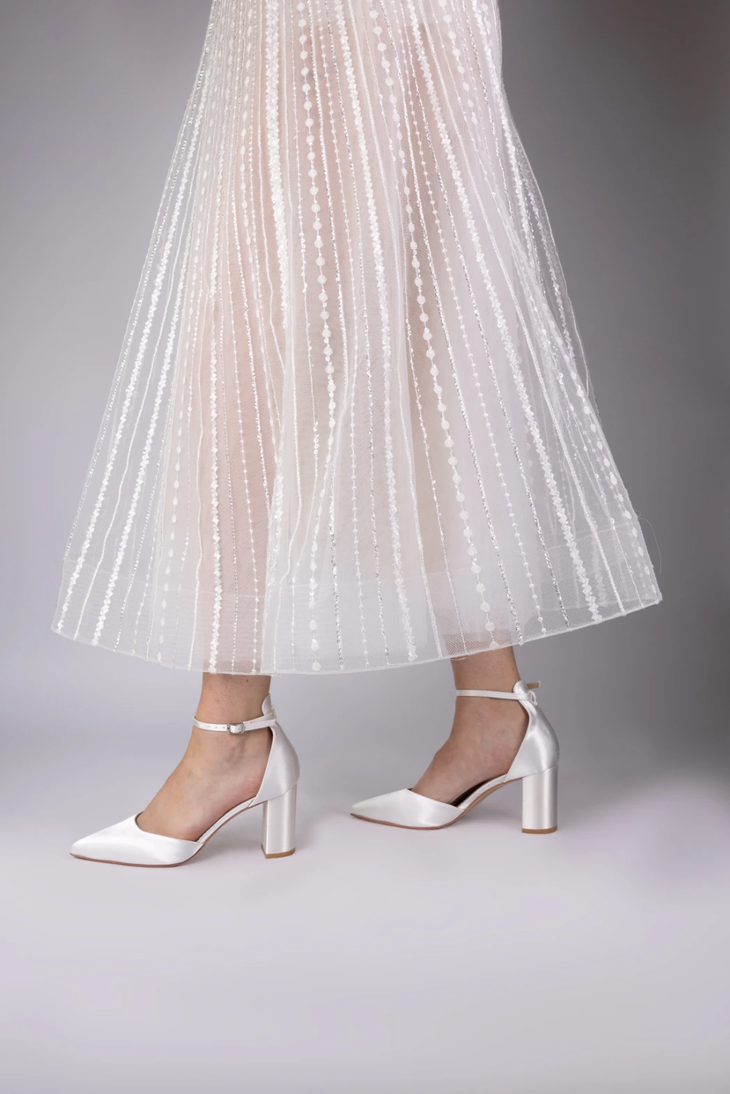 Perfect Bridal Liberty Shoe in Ivory Satin. Liberty are a satin, mid heeled sandal with a fully enclosed pointed toe, block heel and high back ankle strap to keep you feeling in control. This shoe is perfect for the whole wedding day and the evening reception, to dance the night away!