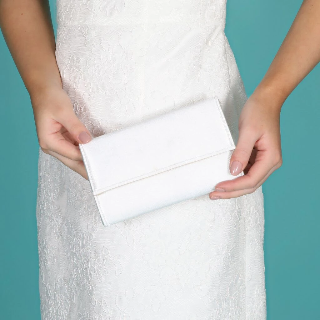 Perfect Bridal Lola Handbag. A modern, assymetric flap compact clutch bag in Dyeable ivory satin!