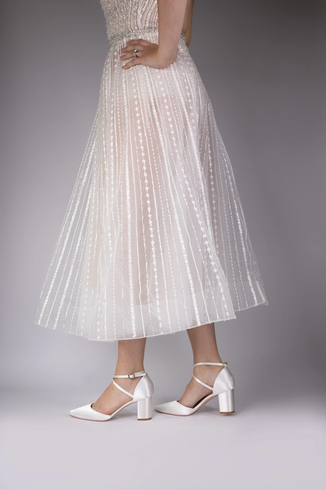 Perfect Bridal Maisie Shoes in dyeable Ivory Satin. Maisie are a mid height block heel shoe with a sleek pointed toe and a cross over strap to ensure that no matter the shape of your foot, you will feel comfortable and confident in them all day long!