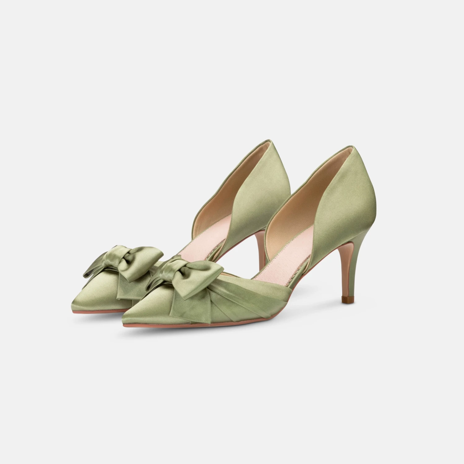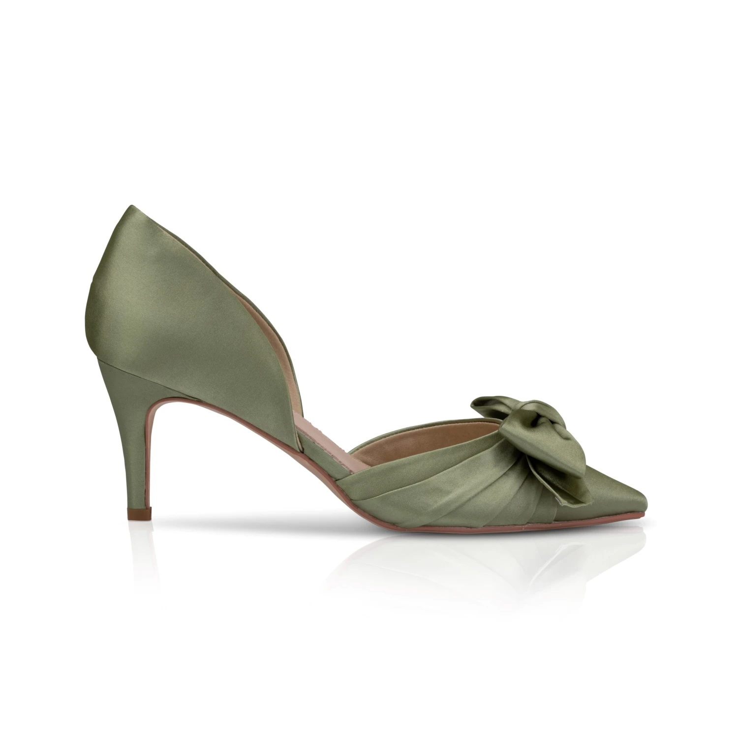 Perfect Bridal Margo Shoes in Olive Satin. Margo are a sleek Berry satin shoe with an Olive satin bow on the top of the pointed toe. A slim mid heeled sandal which are perfect for the whole wedding day experience!