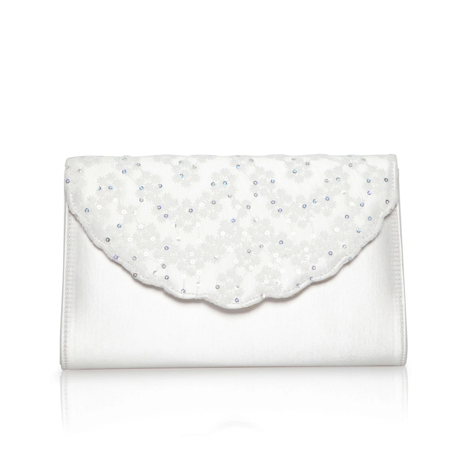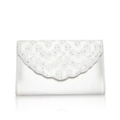 Perfect Bridal Nutmeg Handbag. A modern, scalloped envelope flap compact clutch bag in Dyeable ivory satin with lace and sequins on the flap!