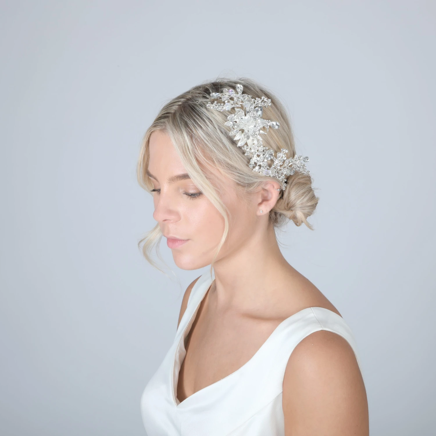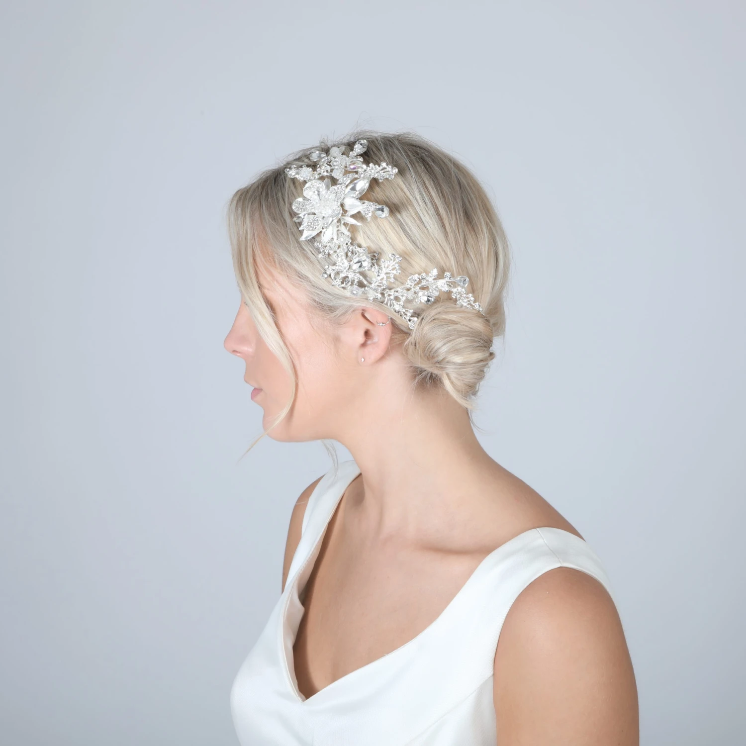 Simply stunning! This headpiece is the perfect sparkly statement and can be worn on the side of the head with hair up or down for that sparkling statement piece!