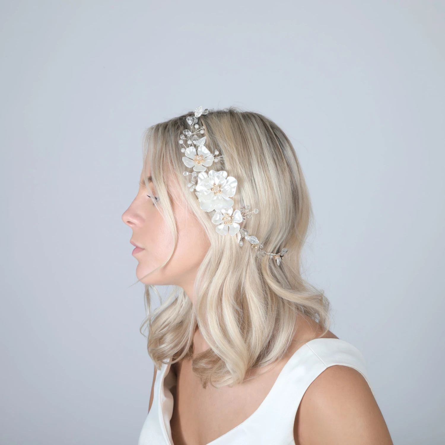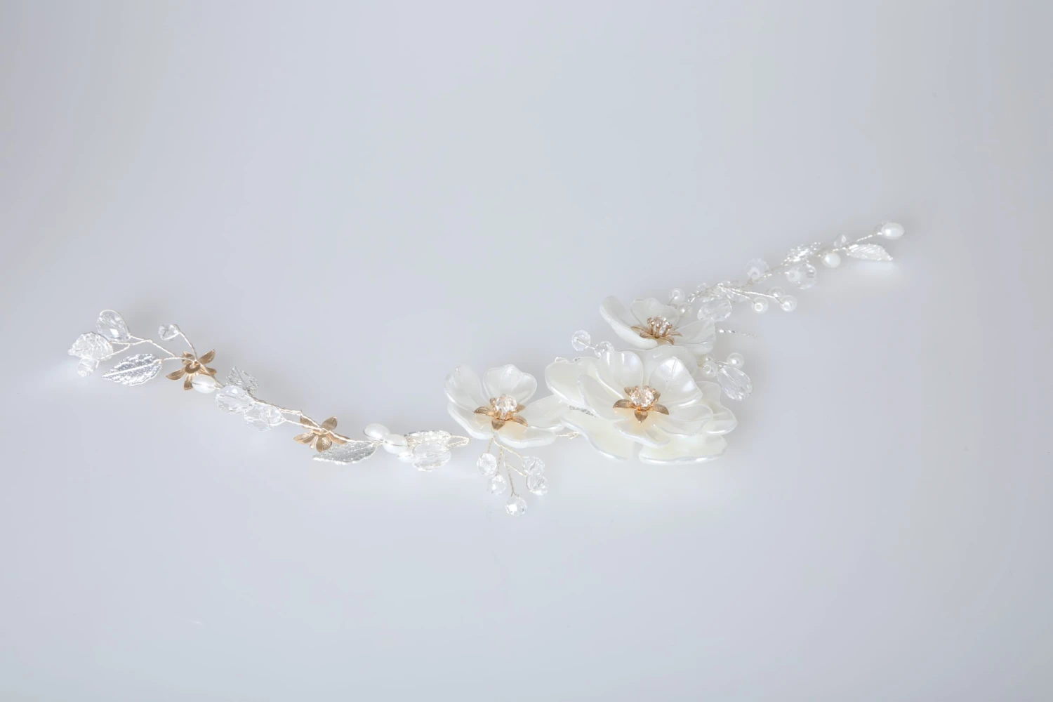 Perfect Bridal have brought a new range of hair accessories to the world of bridal. This wedding hair vine, is an intricate and pretty floral hair vine set with clear crystal beads and pearls and a delicate gold tone to the centre of the flower details. This vine is very flexible and can be worn to suit almost any hairstyle.