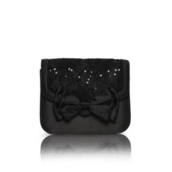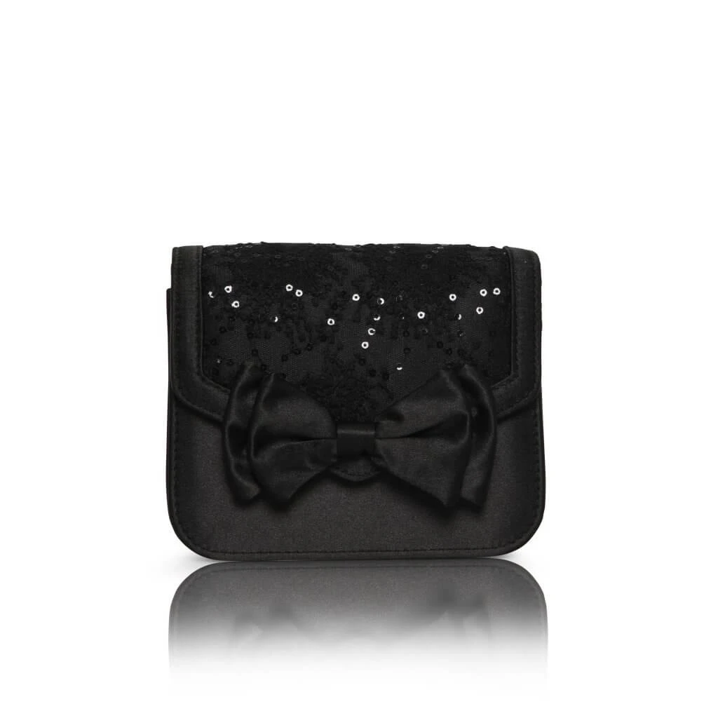 Perfect Bridal Pepper Handbag. A modern, envelope flap compact clutch bag in Black satin with lace and irridescent sequins on the flap and a large satin bow!